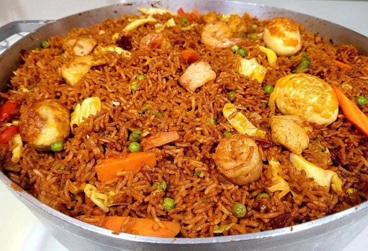 Delicious jollof rice served with variety of meats and vegetables.