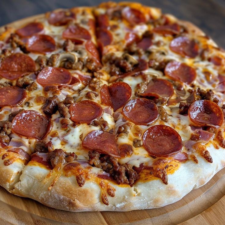 A pizza topped with a variety of toppings for a rich flavor.