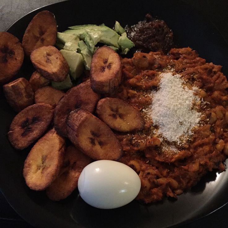 Delicious beans with fried plantain and egg.